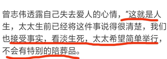 8月10日,曾志伟接受媒体采访谈及对于妻子去世的心情,他表示"这就是人生,我们也接受事实,看淡生死,不会有特别的陪葬品"。对待人生非常看得开,不过这样的语气被很多网友感到不在乎。