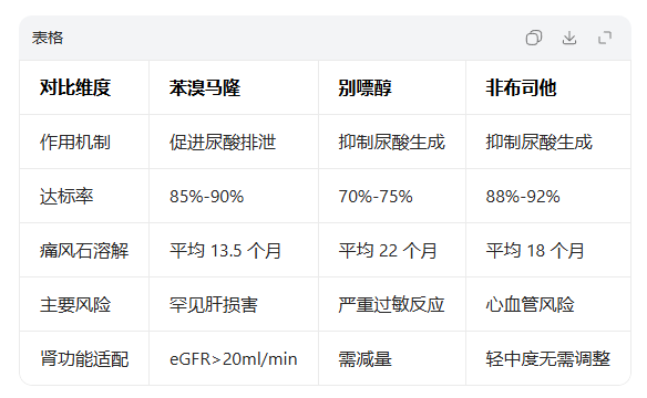 临床选择需遵循 “分型、分人群、分风险” 原则:肾排泄不良型(占比约 90%)优先选苯溴马隆;尿酸生成过多型可选别嘌醇(基因阴性)或非布司他;合并代谢综合征、需改善胰岛素敏感性者,优先苯溴马隆;对别嘌醇过敏、肾功能不全者,可选非布司他(无心血管基础病)。