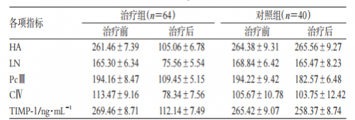 2 组治疗前、后肝纤维化指标(HA、PcⅢ、CⅣ、LN)及TIMP-1治疗前、后检测结果比较详见表1。由表1可见,治疗后治疗组HA、PcⅢ、CⅣ、LN均较治疗前下降(P<0.01),而对照组下降不明显(P>0.05),2组比较差异有统计学意义(P<0.01)。治疗后治疗组 TIMP-1 明显下降(P<0.01),而对照组下降不明显(P>0.05),2组比较差异有统计学意义(P<0.01)。
