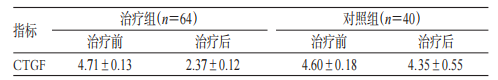 运用免疫组化法对CTGF在治疗前、后半定量分析,结果见表4。 由表4可见,治疗组治疗后CTGF表达较治疗前均明显下降(P<0.05),而对照组治疗后CTGF无明显变化(P>0.05),2 组治疗后比较,CTGF表达差异有统计学意义(P<0.05)。
