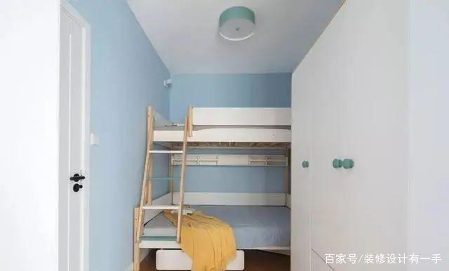 儿童房设计,淡淡的蓝色为主调,选择上下层床铺设计,同时搭配巨大的衣橱,可以保证衣服和床被的收纳,把手也是选择了淡蓝色,塑造出清新明框的卧室范围,更适合孩子。